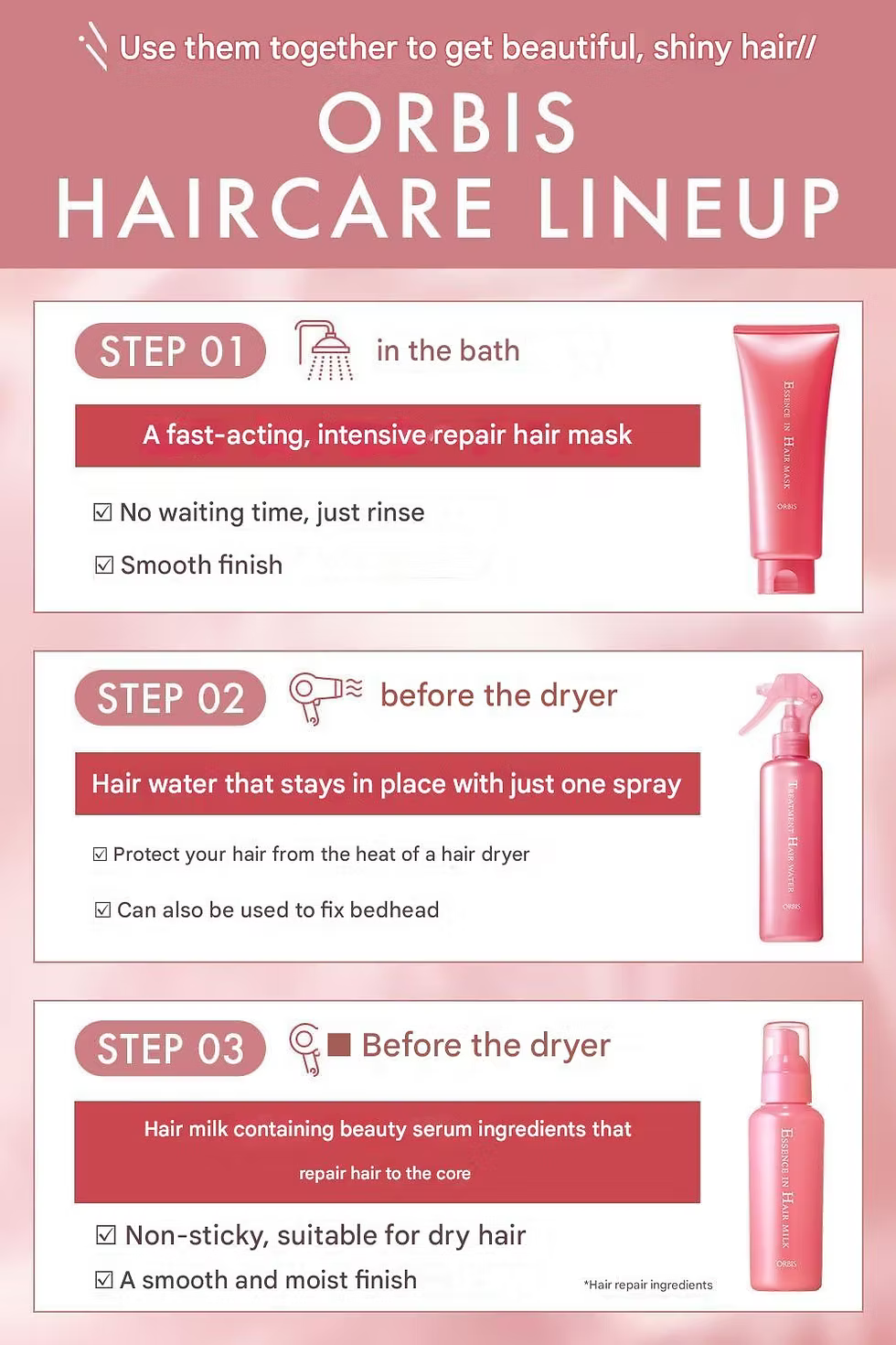 This is a non-rinse type treatment that solves hair problems such as dryness, spread, split ends, and lack of luster. Easy to use, take an appropriate amount and apply it to towel-dried hair (or dry hair), focusing on the ends. Uses the heat of the dryer to create a pseudo-cuticle for smooth finger combing. In addition, highly water-retaining milk coats the surface of the hair to retain moisture. Keeps your hair moisturized, healthy, and beautiful all the time with thorough care from inside and out. This product is fragrance-free, color- free, oil-free that easily oxidizes and alcohol-free.